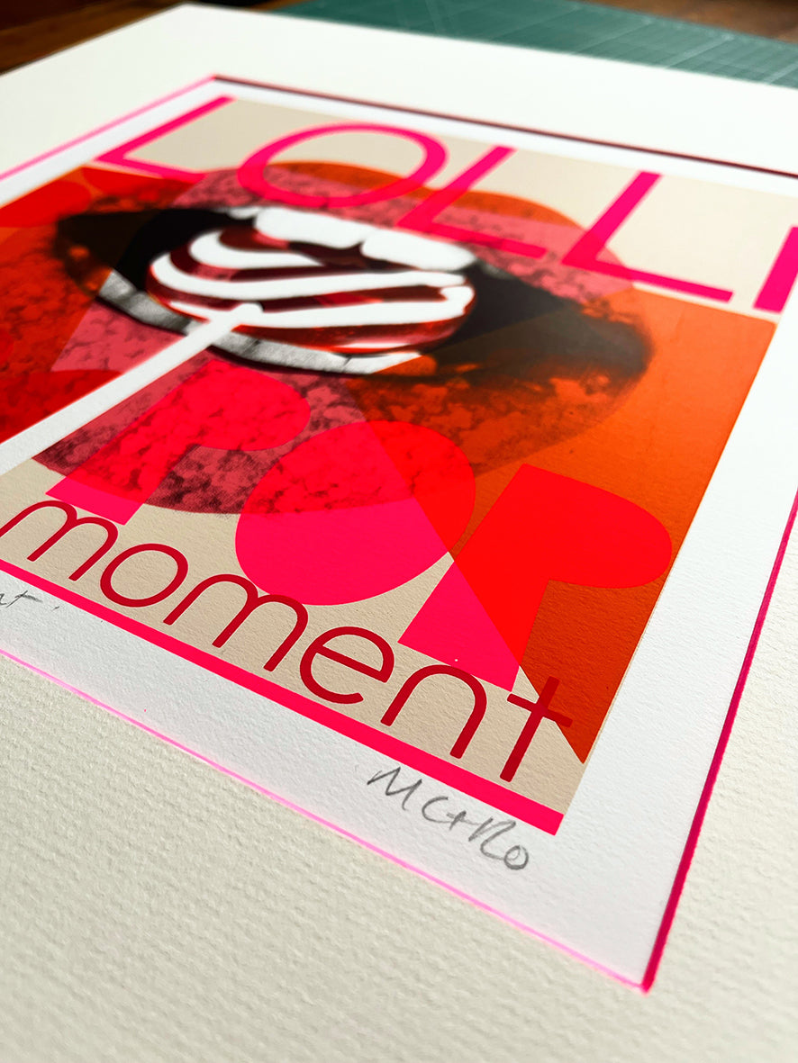 I’d come across the term “Lollipop Moment” recently and thought it was interesting. Similar to ‘Sliding Doors’ it refers to a small, often unnoticed act of kindness or encouragement that can have a lasting impact on someone’s life. My print features a close-up of a mouth with a lollipop - bold, poppy colours like orange and neon pink were used to reflect both the fun and the significance such seemingly simple moments can hold.