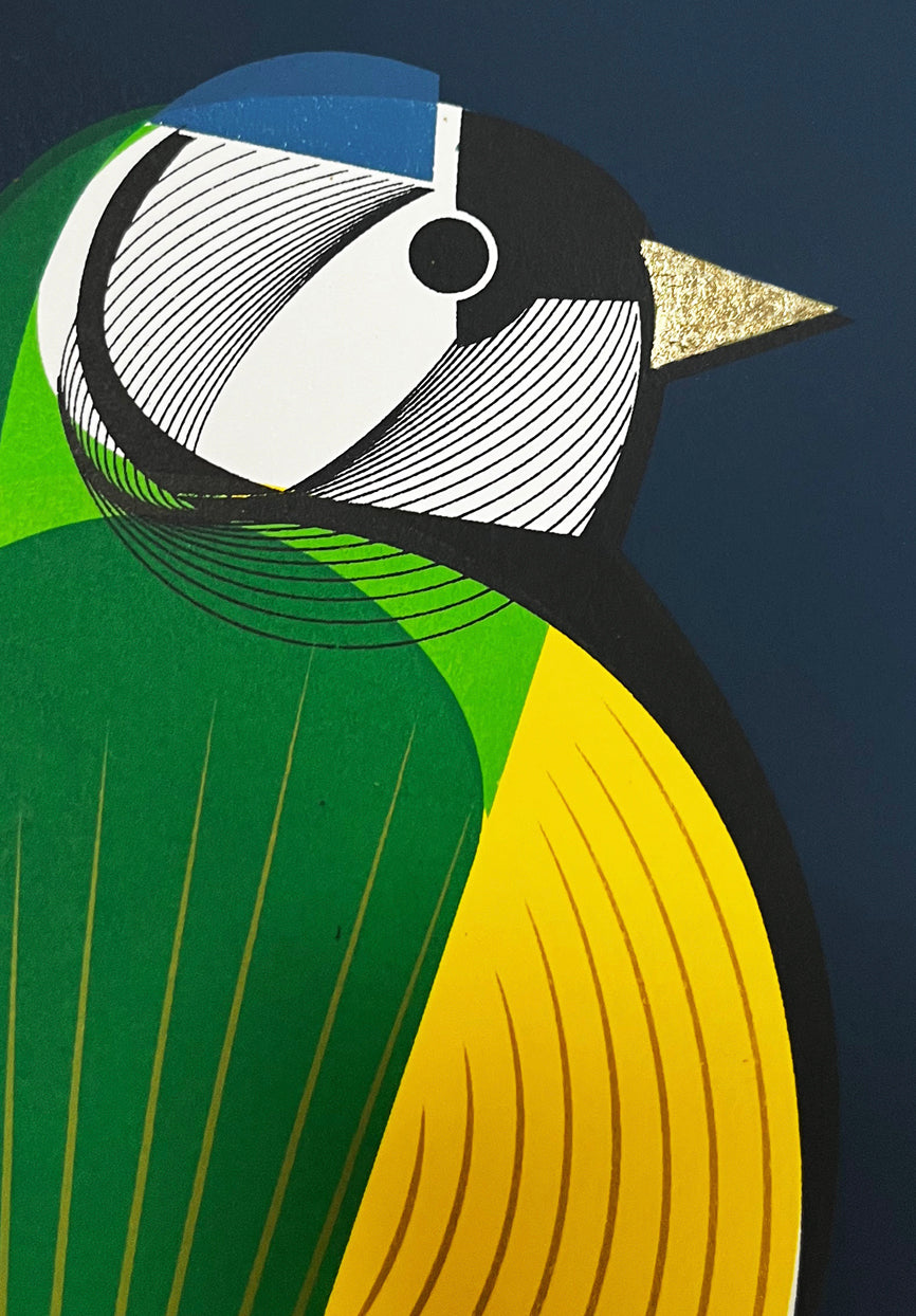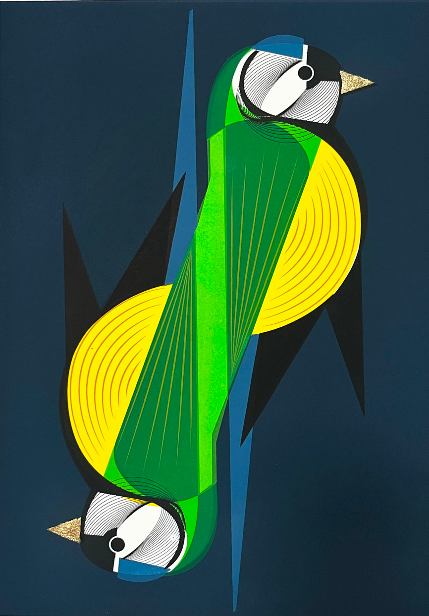 The rich diversity of birds found in Ireland sparked my creativity, inspiring me to conceptualise a garden bird that seamlessly fuses the hues of blue and green tit species. This dynamic seven-colour print features a contemporary palette that is both daring and vibrant. In this reworked edition, gold leaf detailing - on the beaks & wings add depth and a subtle sense of luxury.